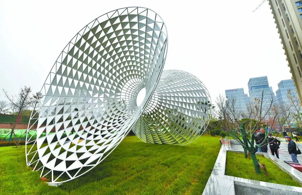 鱼跃园占地约3.5万平方米,以原有山体绿化为基底,通过巧妙融入文化元素,将以往功能单一的绿化区域,打造成生态与景观交融的城市休闲空间。曾经废弃的渣土山,如今草木错落、坡地起伏,往日灰头土脸的角落,已重塑为一片生机盎然的绿丘。