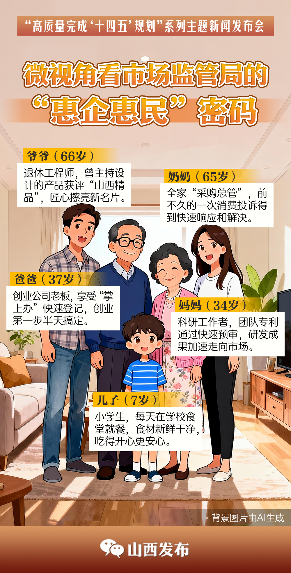 “高质量完成‘十四五’规划”系列主题第二十场新闻发布会今日举行。从一家五口的日常微故事,看山西省市场监督管理局“十四五”期间的扎实足迹。
