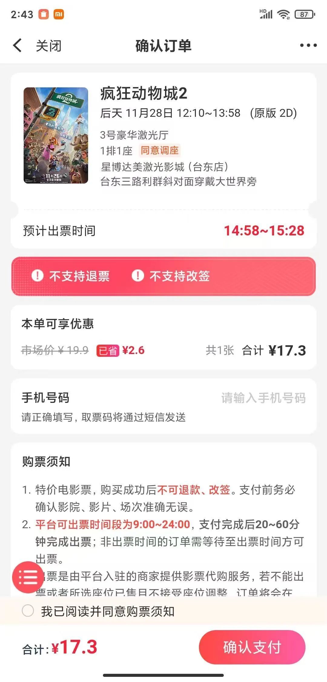 1.特价电影票,购买成功后不可退款、改签。支付前请务必确认影院、影片、场次准确无误。