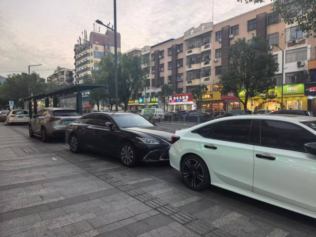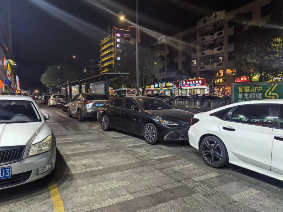 当日夜间,记者再次重返现场,发现这些违停车辆均未驶离。原本宽敞的人行道在最窄处被压缩成仅容两人并行的狭窄通道,行人与非机动车混行现象突出,夜间视线不佳更放大了安全隐患。