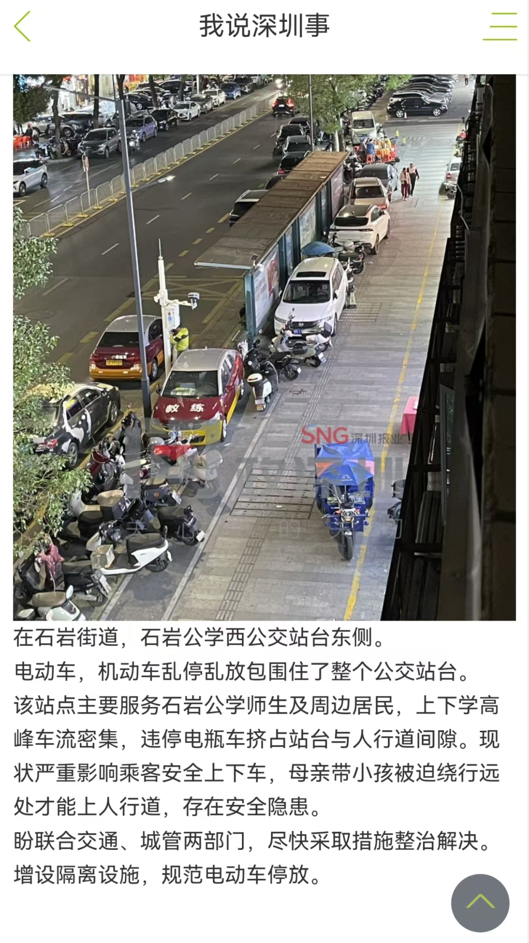 近日,有网友在《问政深圳》发帖称,石岩街道石岩公学西公交站东侧站台存在违停车辆影响乘客出行情况。该网友表示,该站点机动车乱停放情况严重,甚至包围住整个公交站台,致使乘客只能被迫行走到机动车道绕行回人行道,存在一定安全隐患。