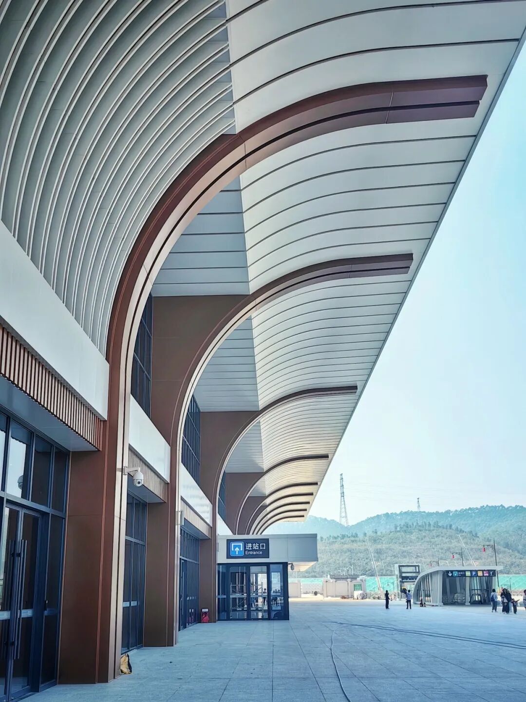 新兴南站位于云浮市新兴县,以“文化传承,大美新兴”为设计理念,结合现代建筑语言,诠释了新兴的文化底蕴。