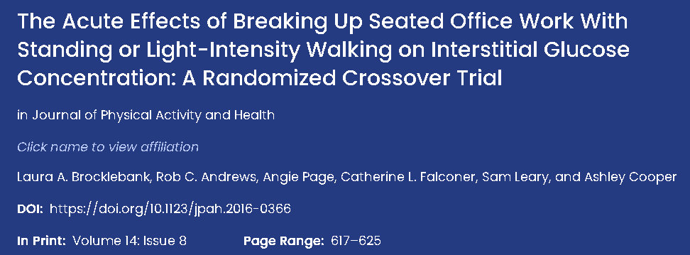 此外,另一项发表在《糖尿病护理》上的研究发现,每坐30分钟,站起来5分钟,就能将餐后血糖上升幅度降低34%,同时使胰岛素浓度下降20%。
