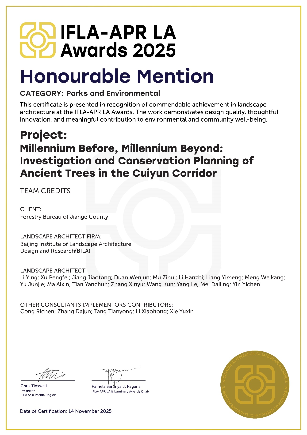 2025年,共有500余个项目参评,最终仅评选出约15%的获奖项目。此次《规划》获奖,是我国古树名木保护领域首个在全球范围内斩获该奖项的专项规划。《规划》凭借前瞻的生态保护视野、科学的技术方法以及扎实的实践成果,向国际社会展现了高敏感遗产地“生态保护与文化传承”深度融合的中国方案,既彰显了我国古树名木保护的先进理念,也让中国生态文明实践获得国际同行的广泛认可。这一突破不仅是剑阁古柏保护工作的重大荣誉,更是我国古树保护领域在国际专业舞台上实现的历史性跨越,成为行业内具有标志性意义的里程碑。