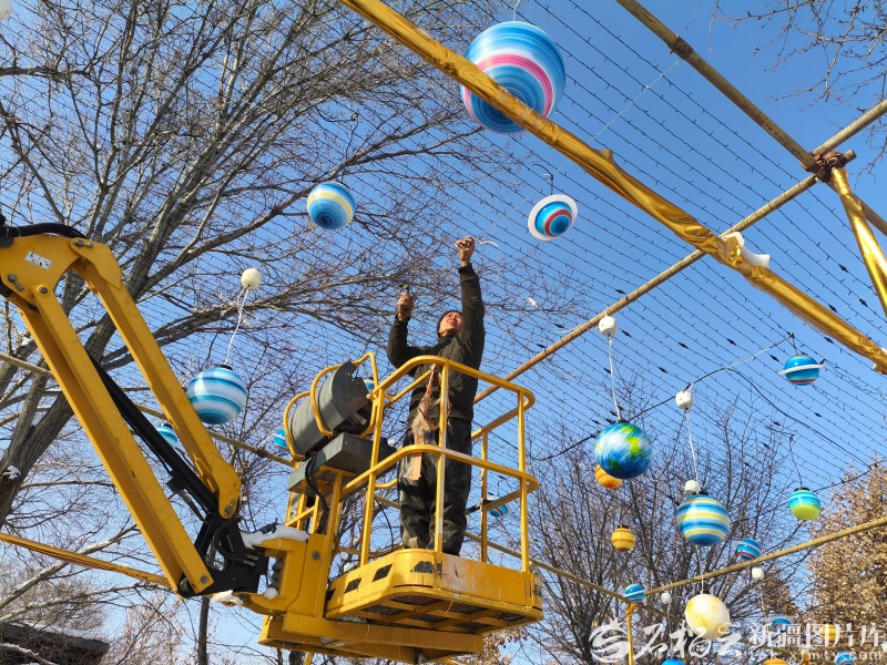 12月16日,在乌鲁木齐市植物园,施工人员正在布置星球天幕。