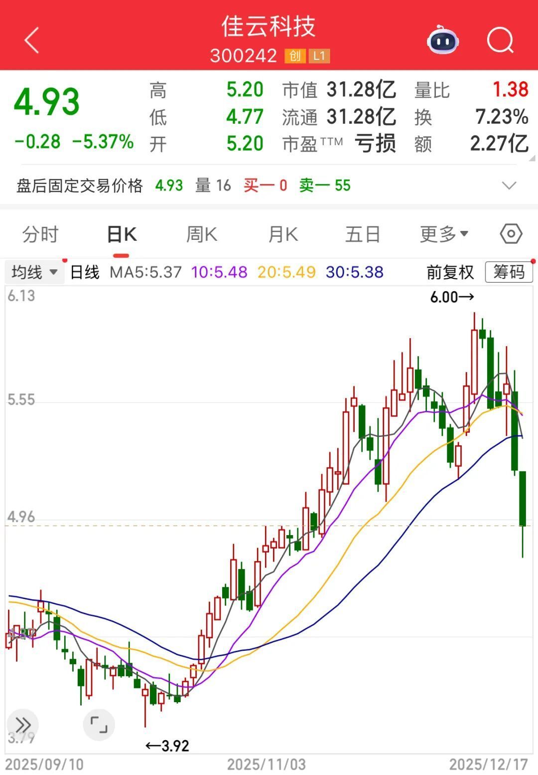 二级市场方面,截至17日收盘,佳云科技下跌5.37%,报4.93元/股,总市值31.28亿元。