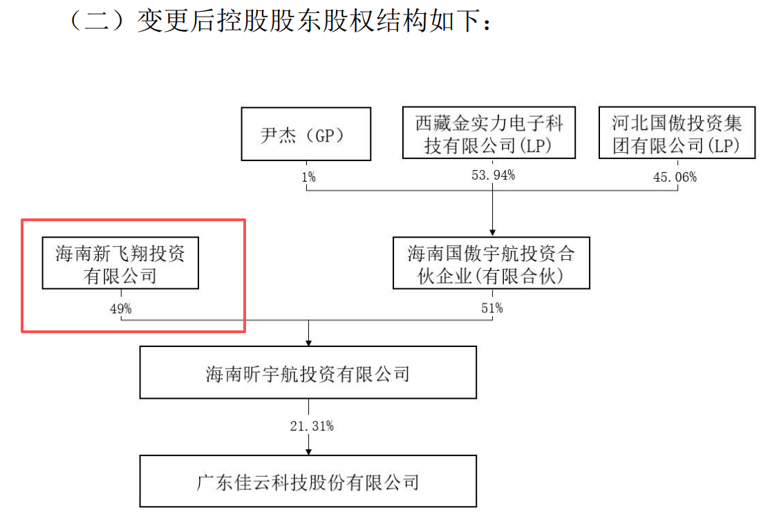 上述债转股完成后,国傲宇航将其所持有的昕宇航49%的股权转让至海南新飞翔投资有限公司(以下简称“海南新飞翔”)。此次控股股东股权结构变动后,佳云科技控股股东仍为昕宇航,实际控制人仍为尹杰。川商传媒记者粗略计算,海南新飞翔将间接持有佳云科技10.44%的股份。