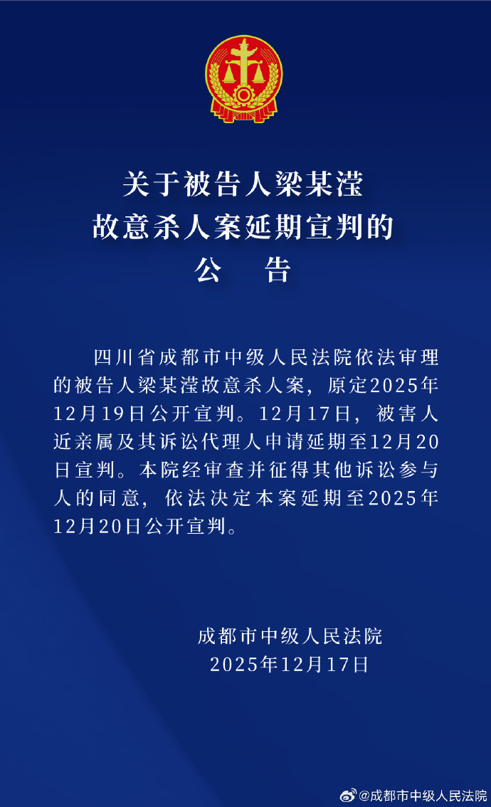 据成都市中级人民法院12月17日消息,四川省成都市中级人民法院依法审理的被告人梁某滢故意杀人案,原定2025年12月19日公开宣判。12月17日,被害人近亲属及其诉讼代理人申请延期至12月20日宣判。成都市中级人民法院经审查并征得其他诉讼参与人的同意,依法决定本案延期至2025年12月20日公开宣判。