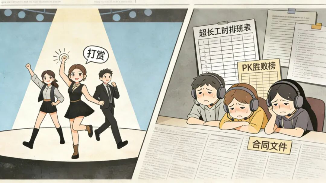 这个突然爆火的行业,往往以“低门槛、高收入、轻松成名”等字眼吸引着做着“明星梦”和“赚钱梦”年轻人。但当聚光灯熄灭,镜头关闭,身处其中的他们,往往面临的是超长工时的压榨、无时无刻不在进行的PK比较、正常工作之外的隐秘“规则”、暗藏陷阱的合同协议以及无处可逃的职场PUA。