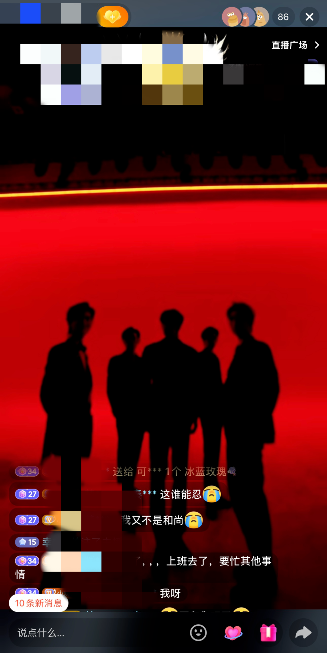 深夜11点,手机屏幕里直播间中依旧喧嚣。一群俊男靓女带着厚重的妆容,脸庞被补光灯照得煞白,腿被特效拉得笔直修长,他们踩着《万物生》《大展宏图》等洗脑神曲的节奏,重复着甩头、扭胯、摸肩、扫腿的统一动作,每十几秒切换一曲,礼物特效在屏幕上不断刷屏,拉票声与PK倒计时的紧迫感交织在一起。