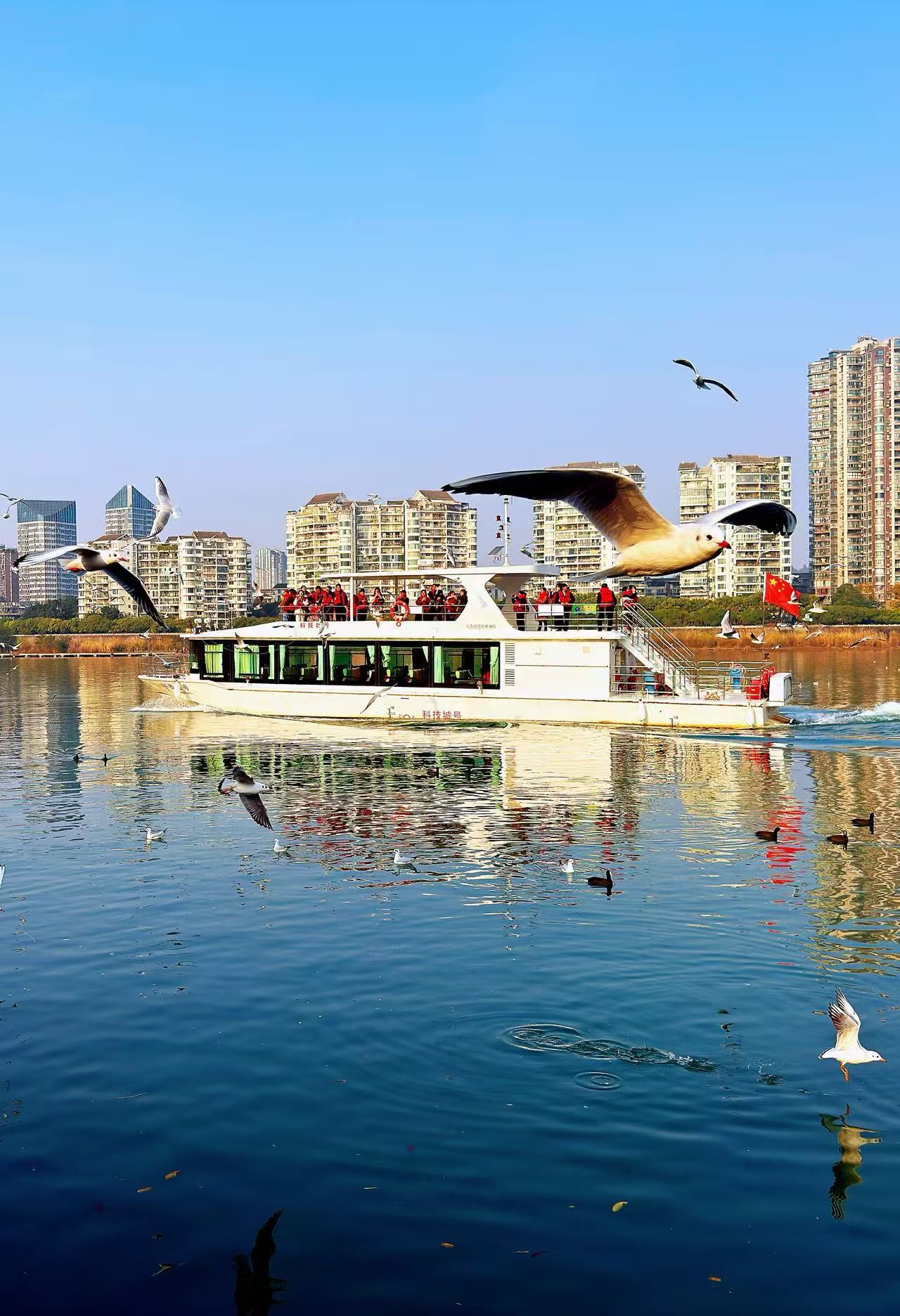乘船观赏红嘴鸥的市民(郭超英 摄)