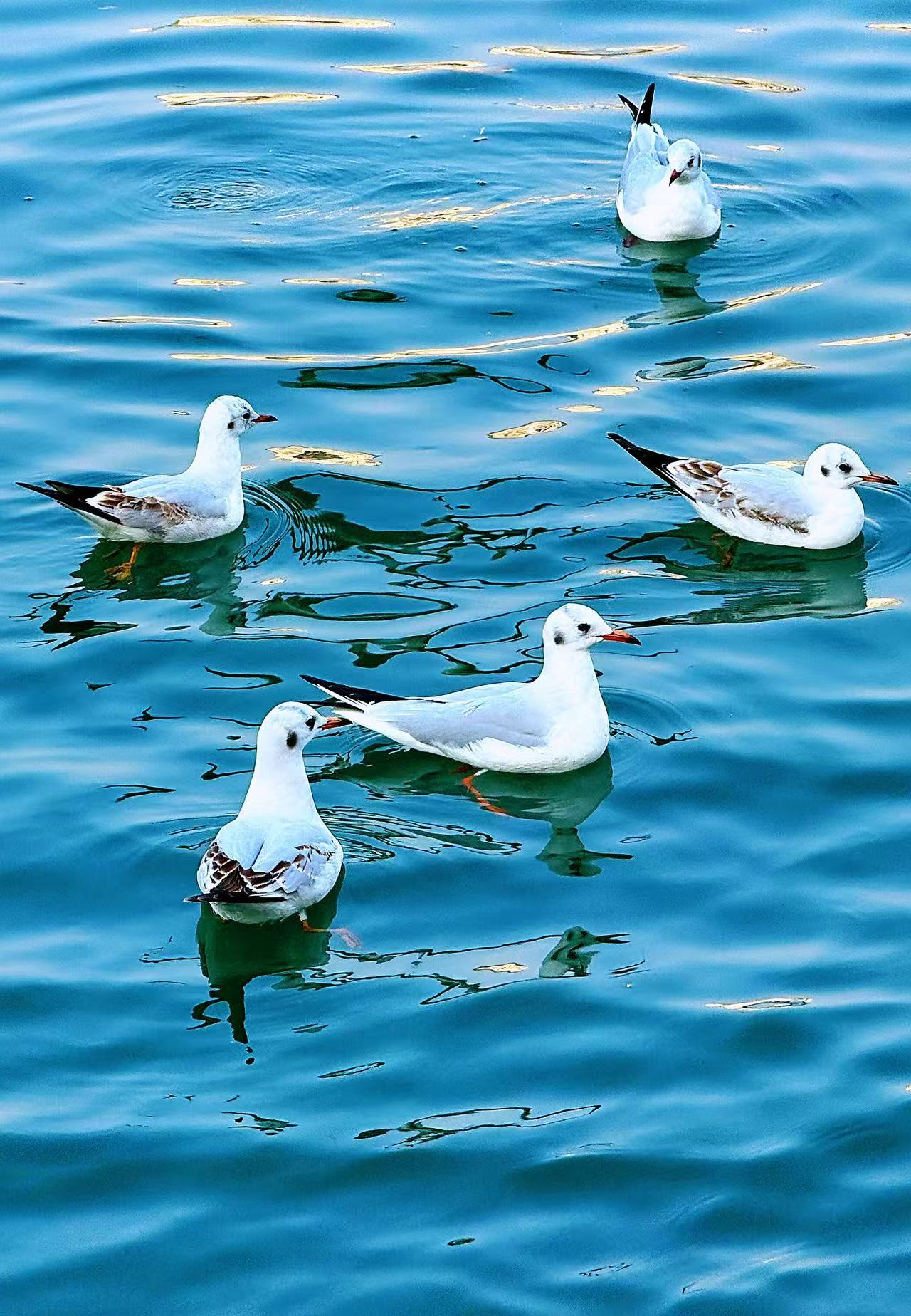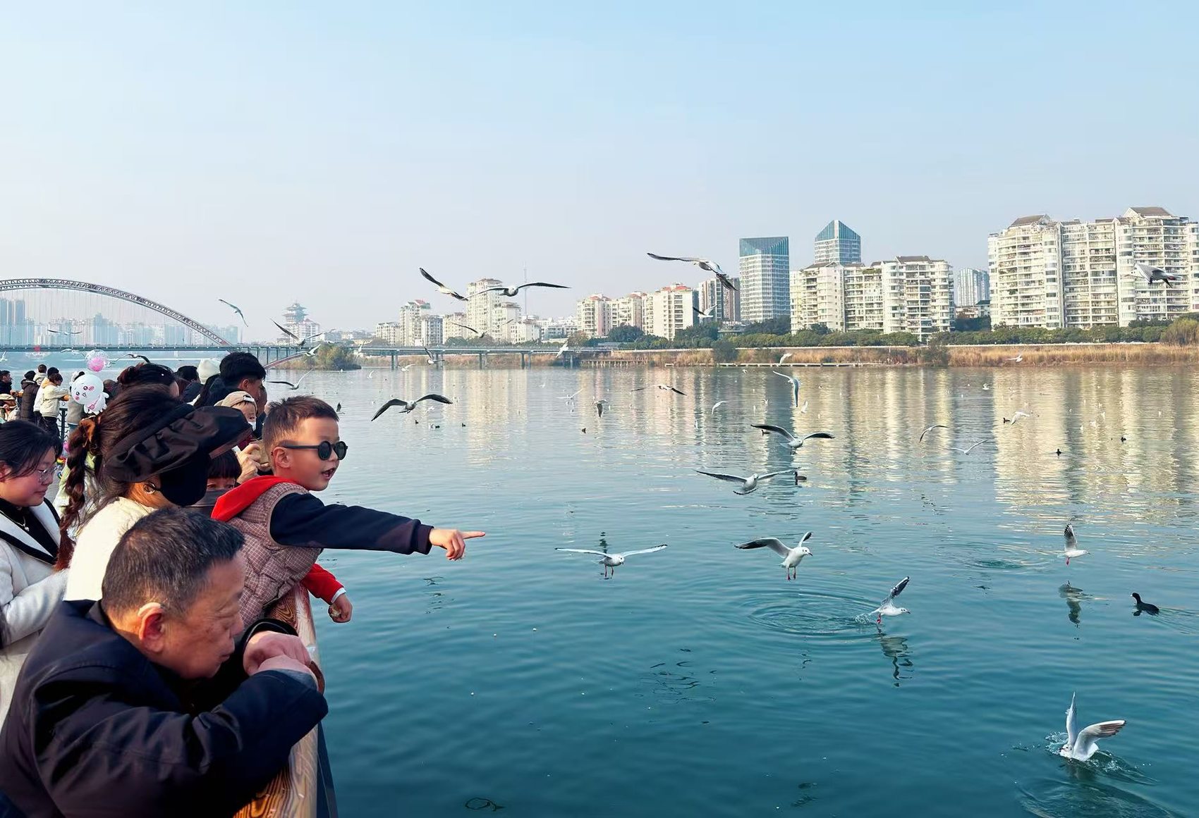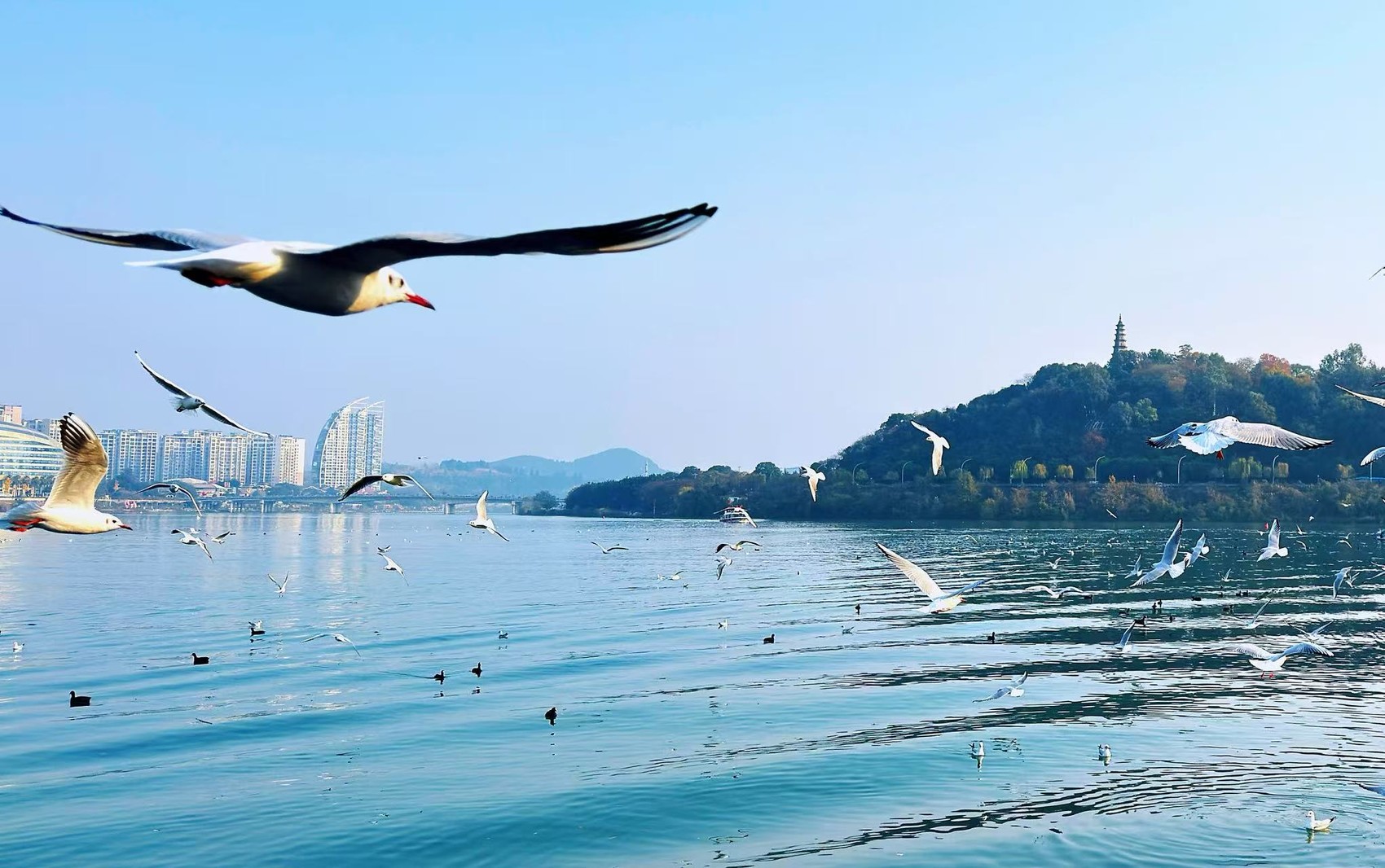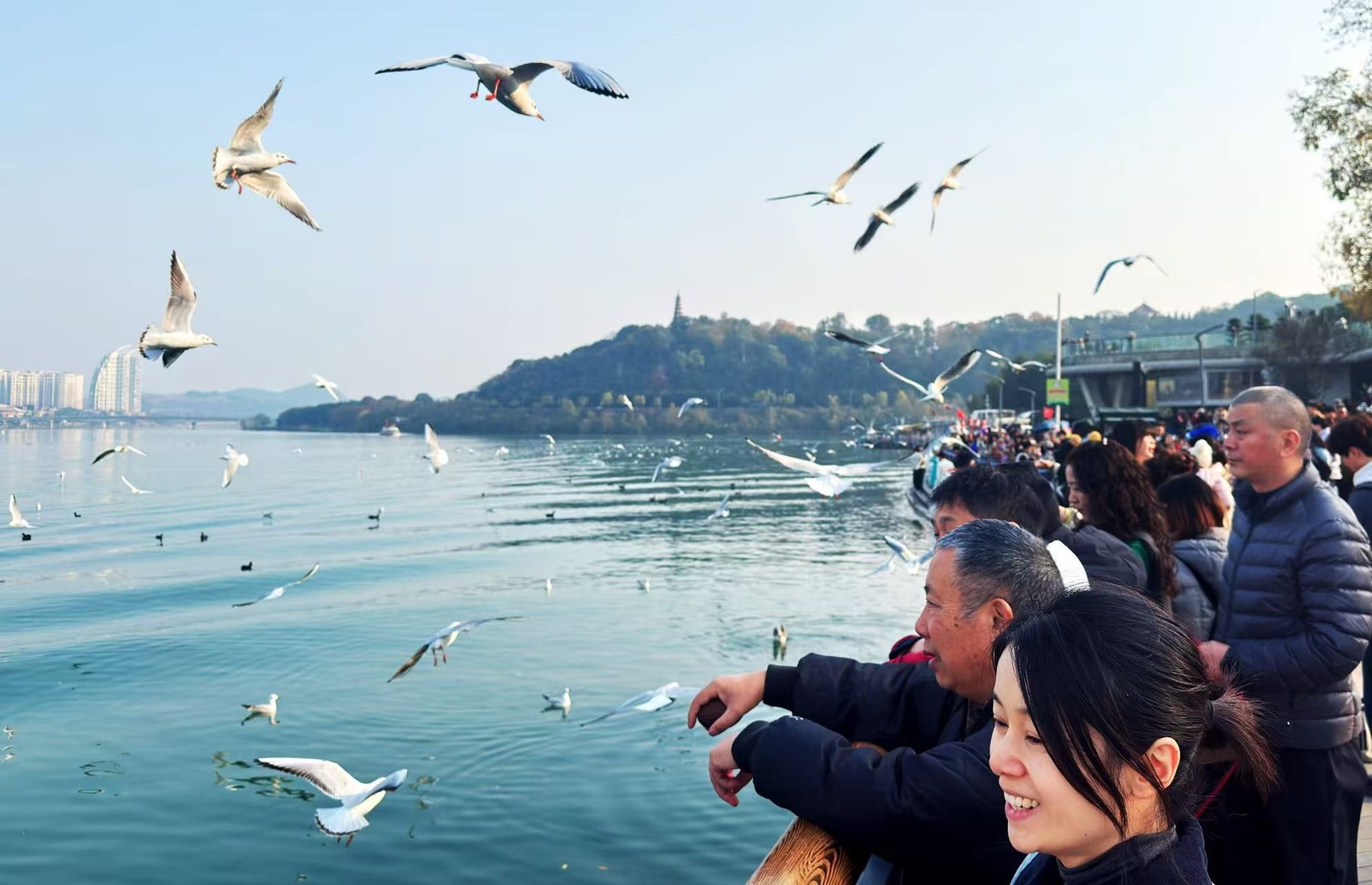 12月16日,绵阳阳光明媚,在三江码头湛蓝的江面上,雪白羽翼间沾满细碎金光的红嘴鸥贴着人群飞掠,引得岸边观赏的人群不时欢呼。投喂、拍照、品茗……此刻,绵阳的冬日浪漫,藏在三江码头的暖阳里。
