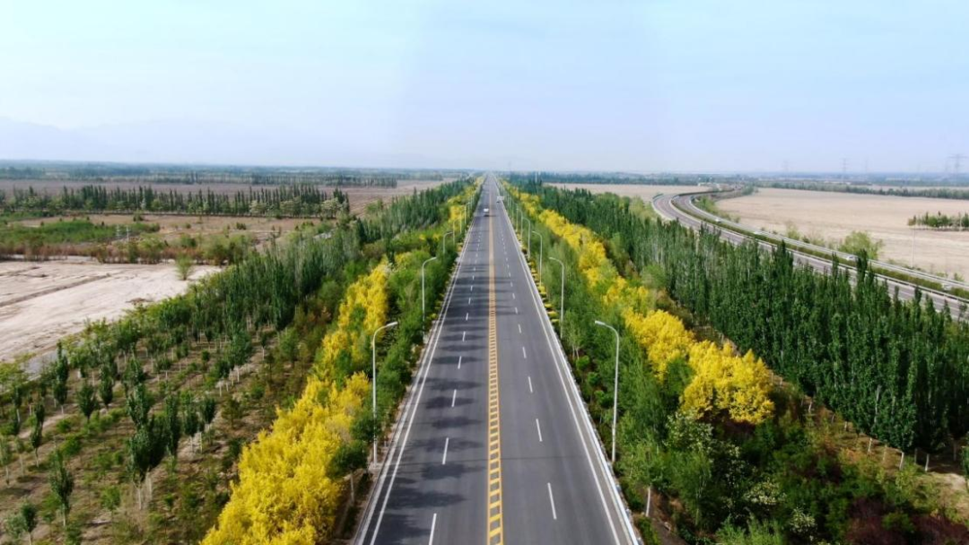 (三)交通组织,让通行更高效,体验更舒适。一是平面交叉“精细渠化”。对K1239+471、K1244+160两处大型平面交叉路口,施划左转、右转专用车道,设置“车道导向箭头+预告标志”,明确车辆行驶轨迹;在闽宁镇产业区路口增设“货车右转危险区”警示标线,提醒非机动车与行人避让,路口通行效率大幅提升,冲突事故数量明显下降。二是景区周边“流量调控”。联合公安部门在贺兰山岩画、西夏陵等景区周边实行“旅游高峰期临时交通管制”,通过“远端分流、近端疏导”,引导旅游大巴、自驾车辆驶入专用停车场;开通“景区接驳专线”,实现“公路—景区”无缝衔接,2024年累计服务游客12万人次,有效缓解景区周边交通压力。三是慢行体验“景观融合”。在公路两侧3—10米宽的绿化景观带内,打造“四季有景”的骑行与步行廊道——春季桃花绽放、夏季蜀葵连片、秋季金叶榆泛黄、冬季侧柏常青,沿途设置5处观景台,可远眺贺兰山雄姿、近赏万亩葡萄园风光。