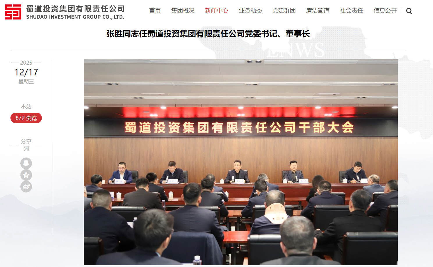 记者从蜀道集团获悉,2025年12月17日下午,蜀道投资集团有限责任公司召开干部大会,宣布省委、省政府关于公司党委书记、董事长的任职决定:张胜同志任蜀道投资集团有限责任公司党委书记、董事长。