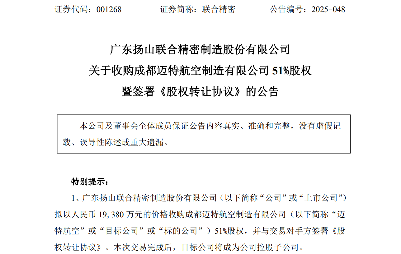 12月16日晚间,广东扬山联合精密制造股份有限公司(证券简称“联合精密”)公告称,公司拟以1.938亿元的价格收购邱廷贵等11个交易对手方合计持有的成都迈特航空制造有限公司(以下简称“迈特航空”)51%股权,并与交易对手方签署《股权转让协议》。本次交易完成后,迈特航空将成为公司控股子公司。