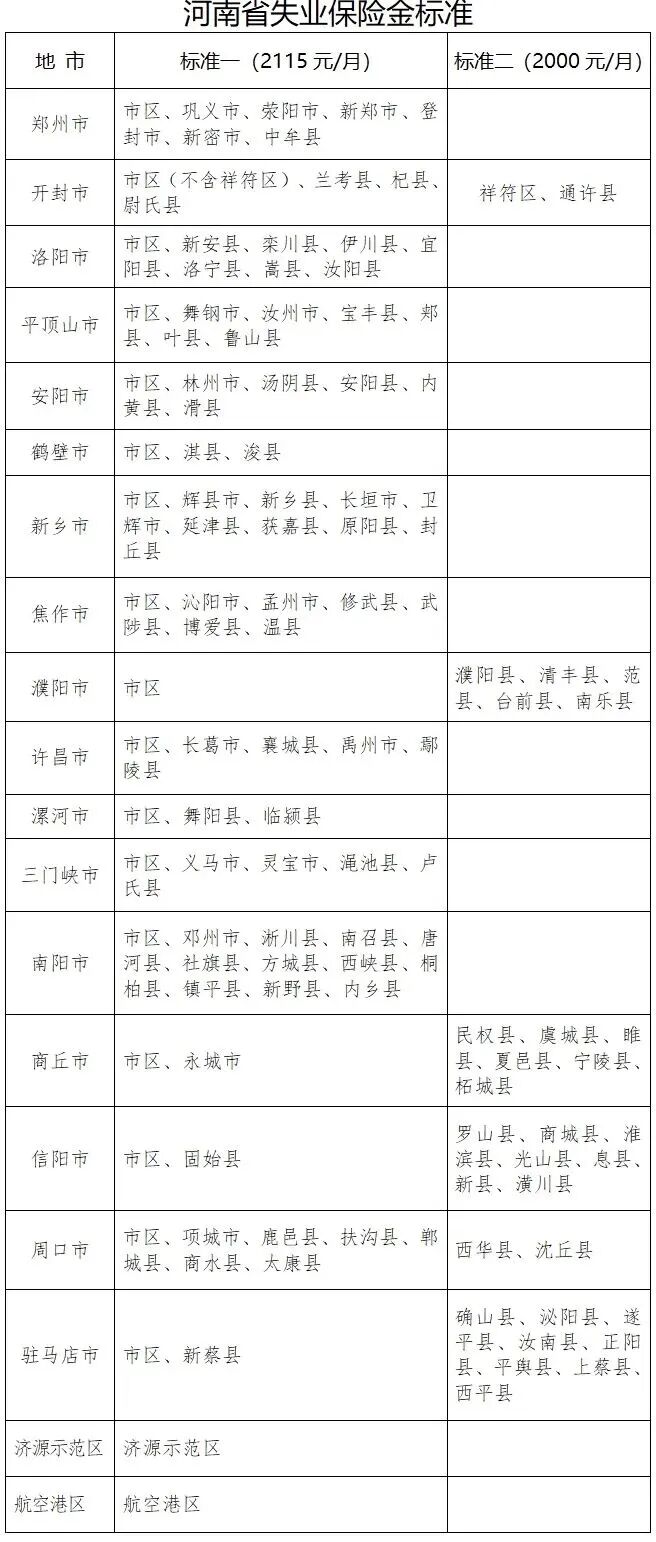 失业保险金基本标准按照全省一类行政区域月最低工资标准的百分之九十确定,调整为2115元/月。其中,基本标准高于最低工资标准的三类行政区域,失业保险金标准按照不高于所在地最低工资标准确定,调整为2000元/月。纳入省直统筹的失业保险参保单位,失业保险金标准参照郑州市市区标准执行。调整标准所需资金由失业保险基金列支。