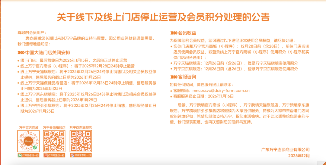 此外,其线上万宁官方商城(小程序)将于2025年12月28日24时停止运营,而天猫旗舰店、京东旗舰店、天猫保健品专营店则将在12月26日停止运营。