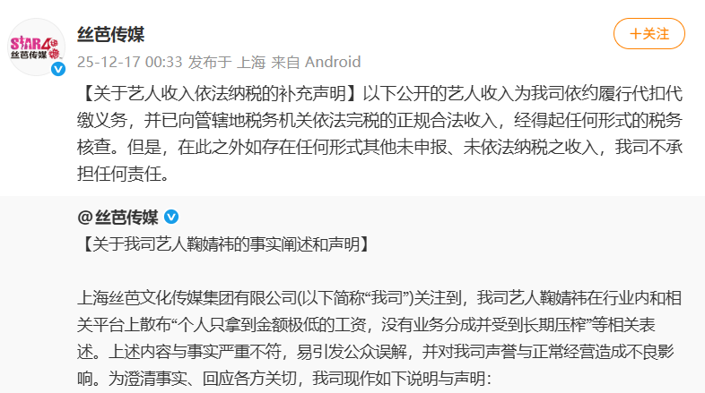 12月16日,@丝芭传媒 发布“关于我司艺人鞠婧祎的事实阐述和声明”,称鞠婧祎在行业内和相关平台上散布“个人只拿到金额极低的工资,没有业务分成并受到长期压榨”等相关表述,与事实严重不符。