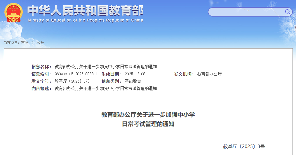 近日,教育部办公厅印发《关于进一步加强中小学日常考试管理的通知》,要求减少日常考试测试频次,提升日常考试质量,强化考试安全风险防范,减轻学生过重学业负担,促进学生全面健康发展。