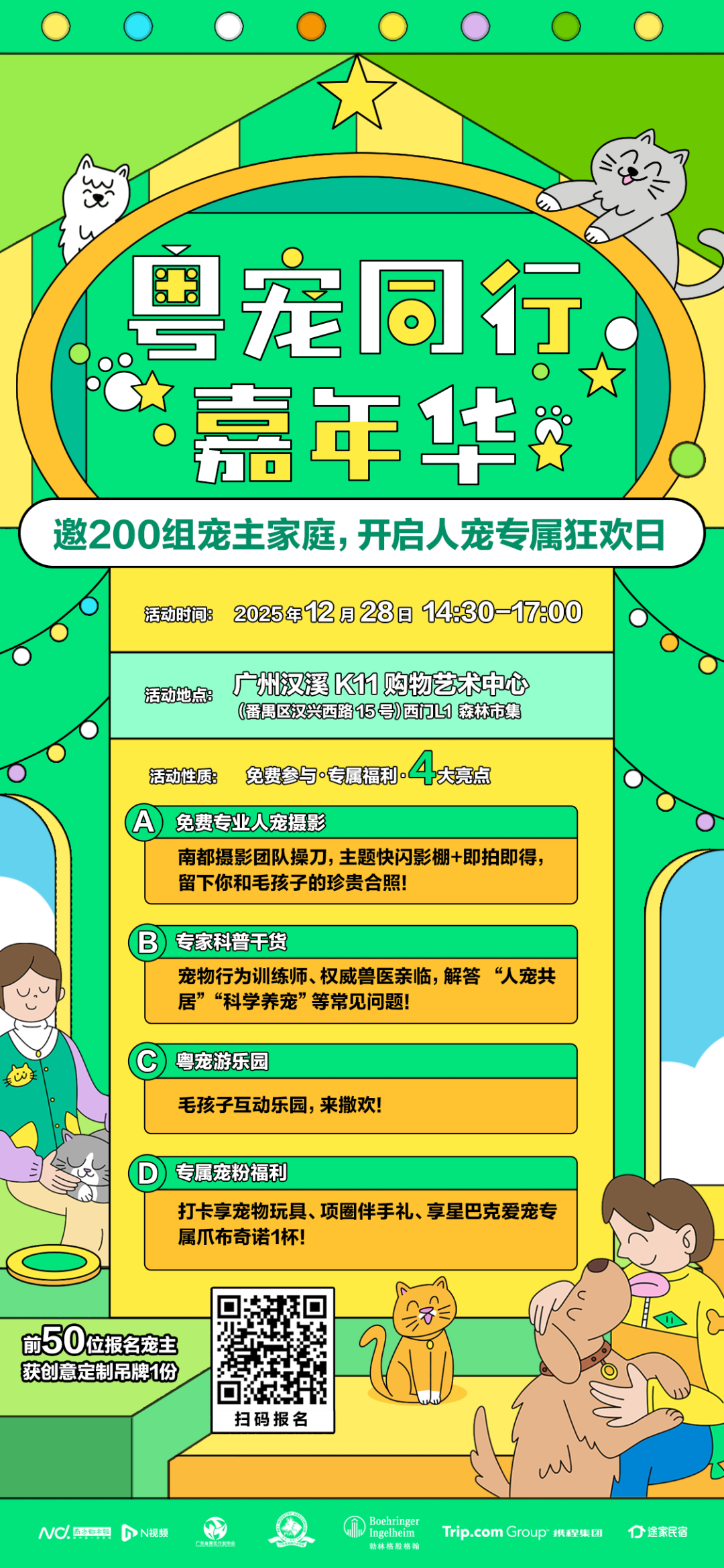 由南方都市报联合广东省景区行业协会、广东省宠物行业协会发起,勃林格殷格翰特别支持的"粤宠同行"宠物友好空间测评项目,将于2025年12月28日在广州汉溪K11购物艺术中心举行“粤宠同行嘉年华暨宠物友好空间测评启动仪式”,现面向全城招募200组宠主家庭,免费参与这场集趣味、干货、福利于一体的欢乐派对!