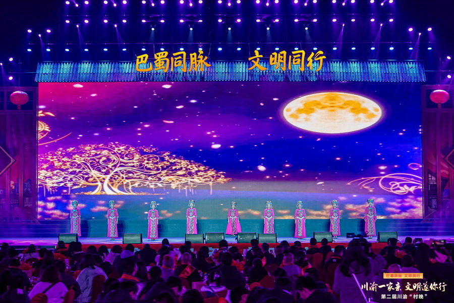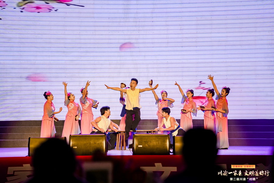 自2024年以来,川渝两地以“跨省共建”模式,联合开展“巴蜀同脉 文明同行”川渝新时代文明实践工作,创新打造川渝文明实践“一廊四带”,始终以深入宣讲党的创新理论、大力弘扬社会主流价值、丰富活跃群众文化生活、持续推进农村移风易俗、广泛开展社会互帮互助等方式,将文明成果送到群众心坎上。川渝“村晚”作为两地持续深化文明实践共建互鉴,进一步健全“一廊四带”工作机制,促进两地精神文明交流合作,丰富川渝群众精神文化生活的重要活动,它的开展生动展现出川渝两地乡村在产业兴旺、生态宜居、乡风文明等方面取得的成果,也勾勒出川渝乡村的和美画卷。