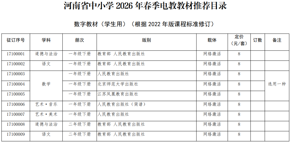 四、规范征订发行。电教教材同纸质教材一样,由全省新华书店统一征订发行,电教教材的征订数据应及时报送当地主管部门,未列入《河南省中小学2026年春季电教教材推荐目录》的电教教材,一律不得进入中小学校。为确保电教教材在开学前与纸质教材同步到校,各级教育行政部门要进一步加强规范管理,确保电教教材经费专款专用、足额征订,严禁任何部门和个人截留、挪用此项费用。