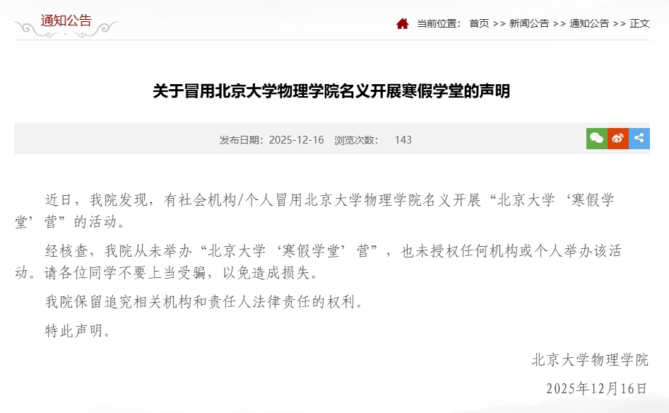北京大学物理学院12月16日发布《关于冒用北京大学物理学院名义开展寒假学堂的声明》: