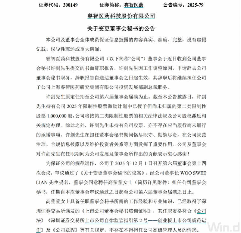 12月12日晚,睿智医药(300149.SZ)发布公告称,董事会秘书高莹莹因工作职务调整,申请辞去公司董事会秘书职务,辞职报告自送达董事会之日起生效。