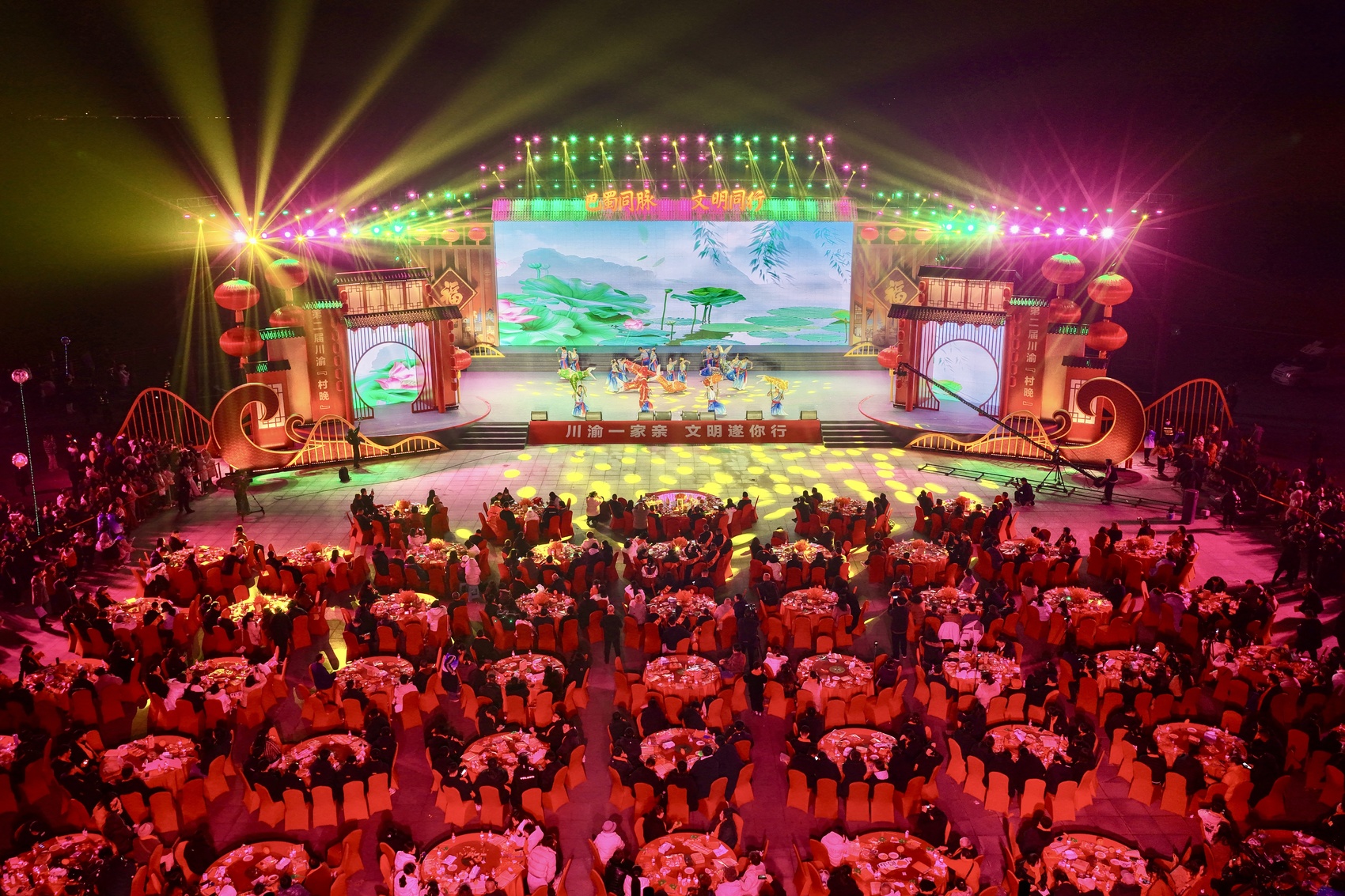 12月17日晚7点,以“川渝一家亲 文明遂你行”为主题的第二届川渝“村晚”在遂宁市船山区仁里镇小河洲社区圣平岛热闹开演。川渝毗邻县(市、区)的200余名农民文艺爱好者自编自导自演的12个节目轮番登台,为两地观众带来了一场独具地方特色的视听盛宴。
