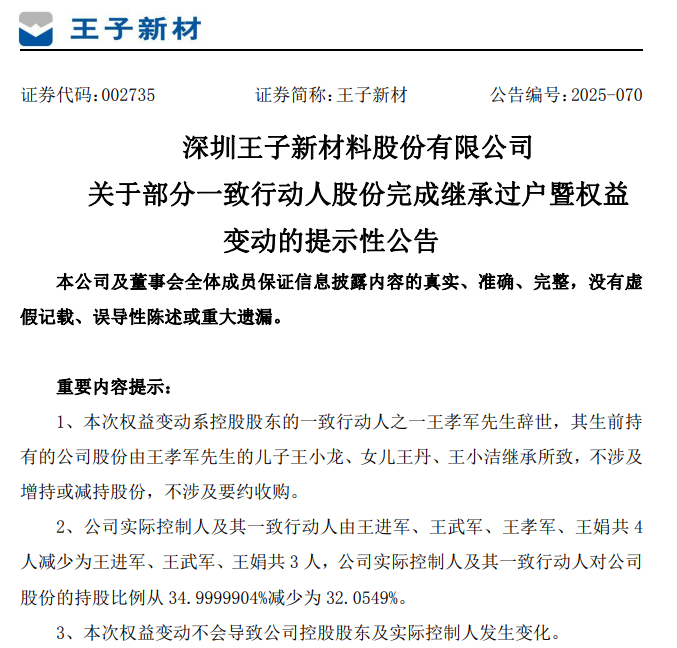 12月16日晚,王子新材(002735)发布公告称,公司自然人股东、实际控制人一致行动人之一的王孝军辞世。根据深圳市先行公证处出具的公证书,被继承人王孝军所持有的公司股份1125.04万股(占总股本的2.95%),由其儿子王小龙,女儿王丹、王小洁共同继承。