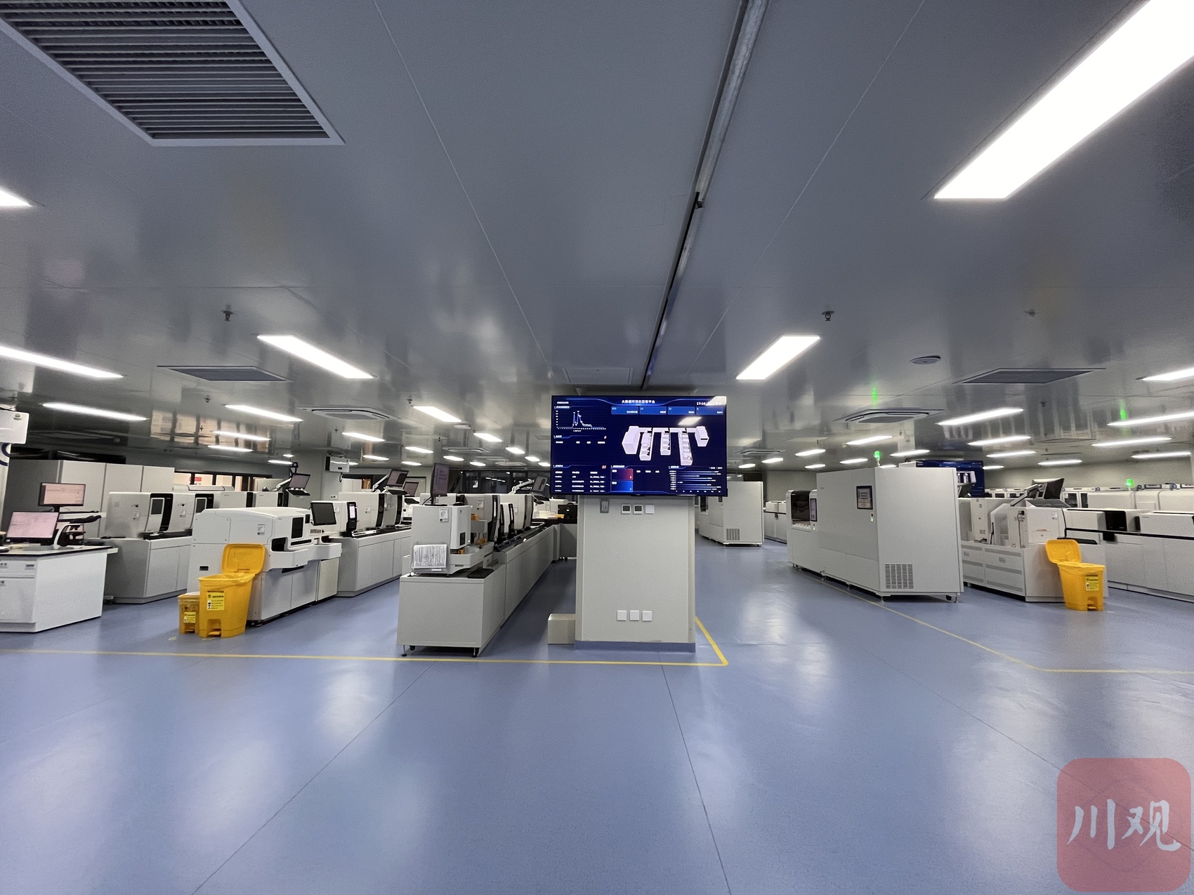 标本经轨道或气动送达后,通过扫码自动分拣至不同检测模块,一旁的大屏幕实时显示样本状态、试剂余量及异常提示,实现全程可追溯、可监管。废弃样本则会通过履带进入“大冰箱”储存,一星期后自动装入医疗垃圾废弃袋。