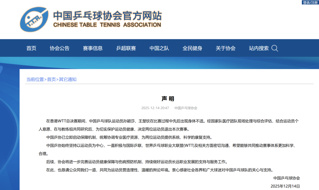 在香港WTT总决赛期间,中国乒乓球队运动员孙颖莎、王楚钦在比赛过程中先后出现身体不适。经国家队医疗团队现场处理与综合评估,结合运动员个人意愿,在与教练组共同研究后,为切实保护运动员健康,决定两位运动员退出本次赛事。