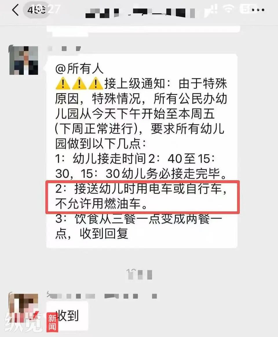 12月17日上午,兰考县某幼儿园小朋友的家长李女士(化名)告诉记者,16日,她所在的家长群收到了上述通知,通知中称“接上级通知......接送幼儿时用电车或自行车,不允许用燃油车”。对于上述通知的要求,李女士认为“这个肯定是不合理的。”
