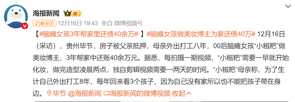 12月17日,“脑瘫女孩3年帮家里还债40余万”相关话题登上微博热搜。