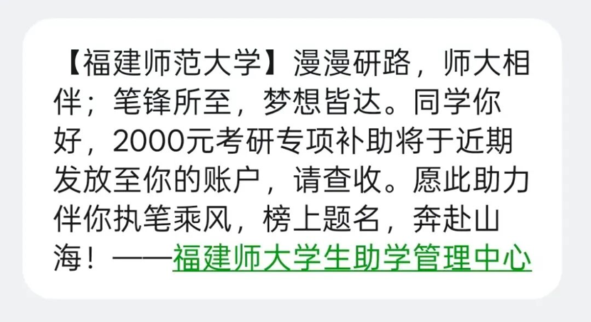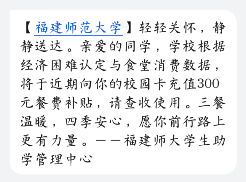 据了解,今年以来,福建师范大学已通过多个资助项目,向327名学子静默发放补助共计23.24万元。这份“悄然到来”的支持,不仅解决了同学们的实际困难,更保护了受助学生的隐私与自尊,实现了资助工作从“人找政策”到“政策找人”的转变。