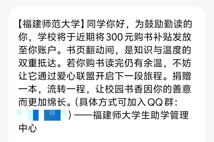 不仅如此,为了推动“书香校园”建设,福建师范大学还对123名借阅图书册数较多的困难学生,按照每人300元的标准发放购书补助。同时发出倡议,鼓励同学们在购书阅读后,将部分图书捐赠给受助学生爱心联盟,由爱心联盟开展图书交流活动,让知识流动,让爱心传递,构建起“受助—成长—助人”的温情闭环。