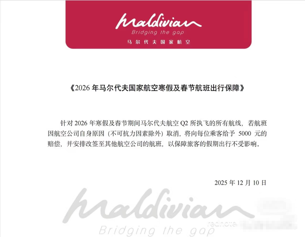 在社交平台上,有多位网友曾发布一张疑似马尔代夫航空公司的官方声明,显示:针对2026年寒假及春节期间马尔代夫航空Q2所执飞的所有航线,若航班因航空公司自身原因(不可抗力因素除外)取消,将向每位乘客给予5000元的赔偿,并安排改签至其他航空公司的航班,以保障旅客的假期出行不受影响。