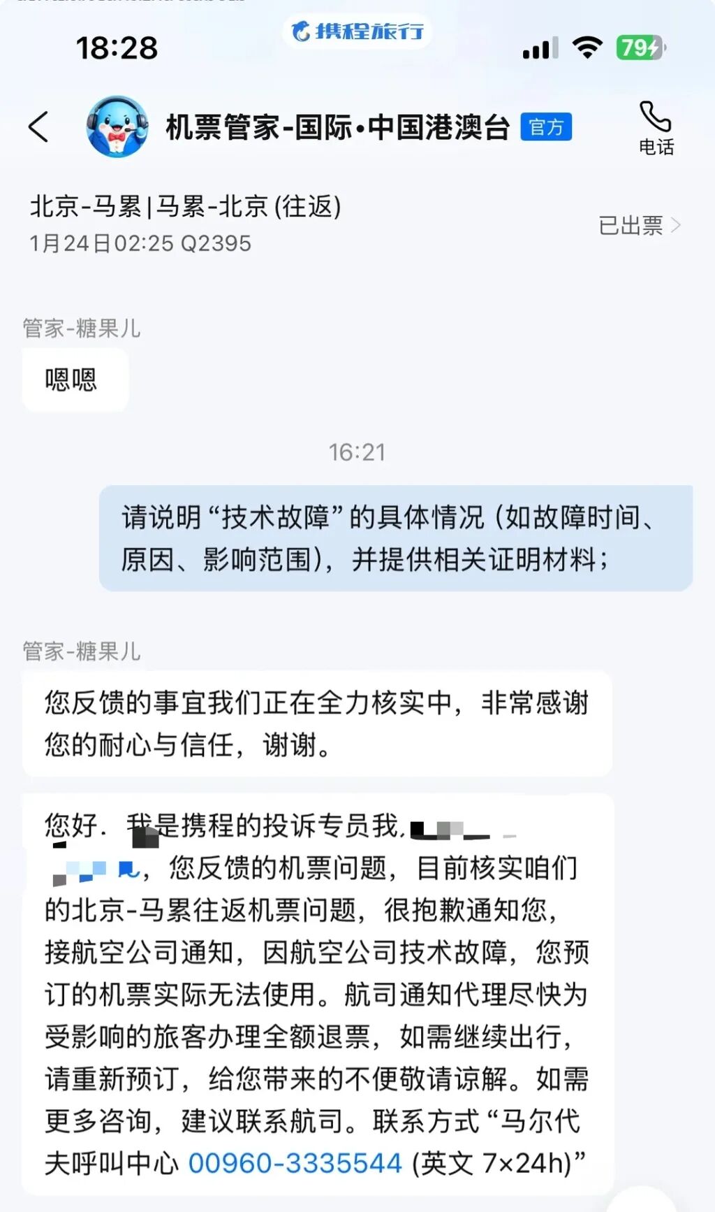 在该网友发布的相关内容评论区内,有网友反映自己在另一售票平台上预订了该航司飞往马尔代夫的机票,遇到了同样的情况,其表示自己购买了1月24日及1月29日北京-马累的往返机票。平台机票管家表示:“因航空公司技术故障,预订的机票实际无法使用,航司通知代理尽快为受影响的旅客办理全额退票。如需更多咨询,建议联系航司。”并附上了马尔代夫呼叫中心的联系方式。