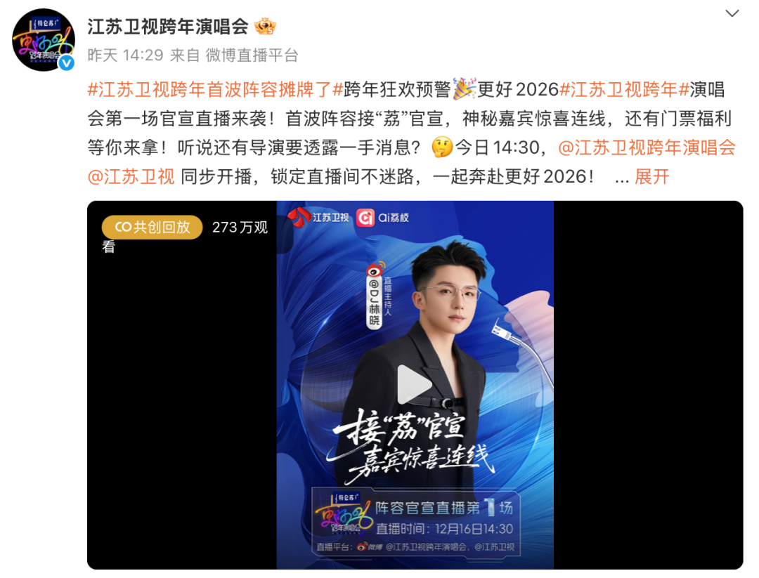 光有物料和互动还不够,江苏卫视还发起了“接荔2026”征集活动,全网粉丝都能定制自己的“跨年TO DO清单”,无论是“和家人一起看跨年”还是“许愿脱单”,你的心愿都可能被带上跨年舞台!这波操作直接让网友参与感爆棚!截至目前,揽获#江苏卫视跨年首波阵容# #江苏卫视跨年首波阵容摊牌了# #沈佳润我在跨晚很想你# #2026江苏卫视跨年演唱会官宣# #看缩写猜江苏卫视跨年阵容#、#沈佳润出道后第一个跨年舞台#、#江苏卫视跨年到底有谁在啊#、#江苏卫视跨年万事OK手势认领# #内娱跨年晚会官宣方式又上新# 等众多全网高位热搜。第一波阵容官宣更获得新华社官方微博关注转发,这排面属实拉满了!