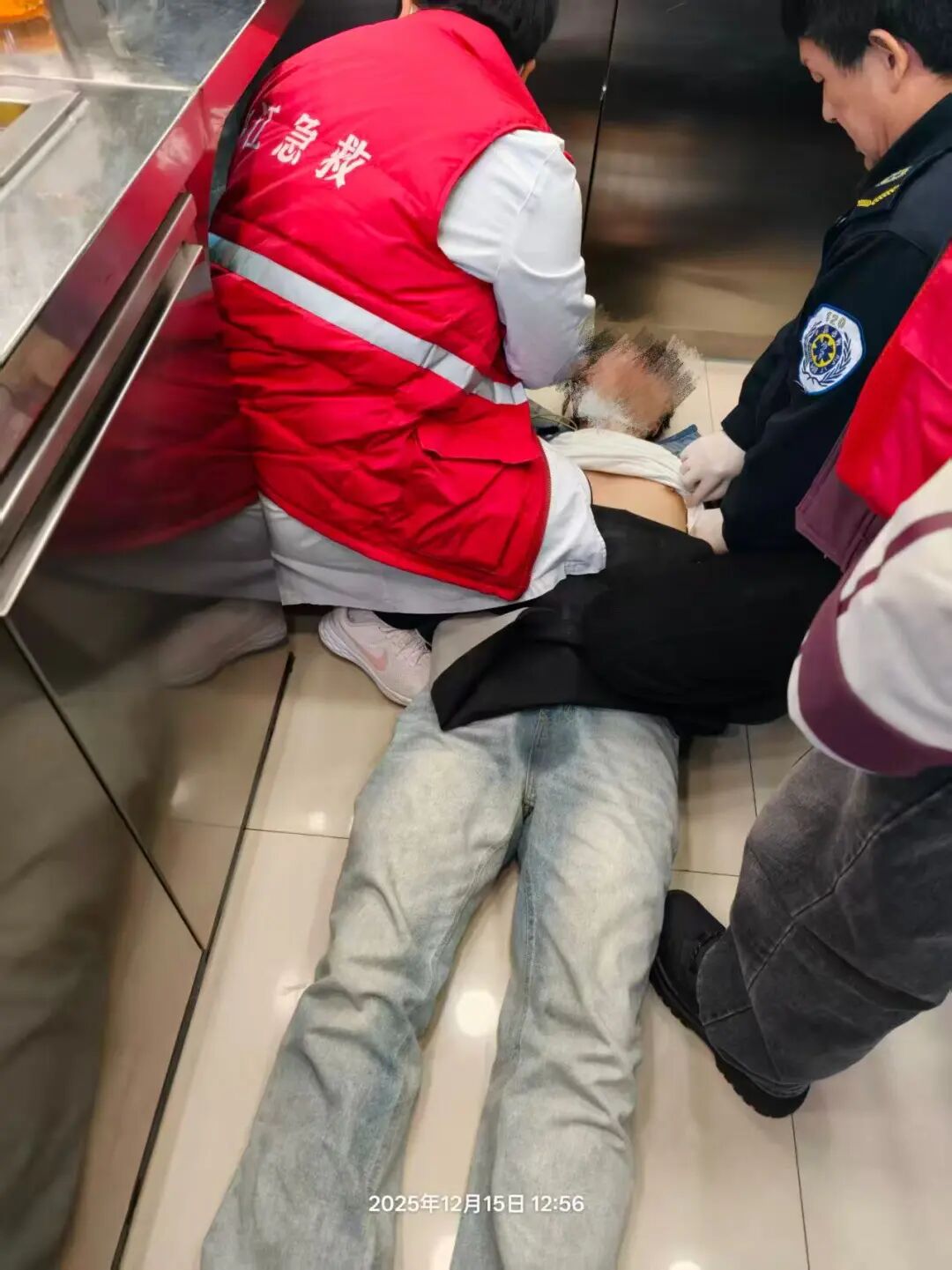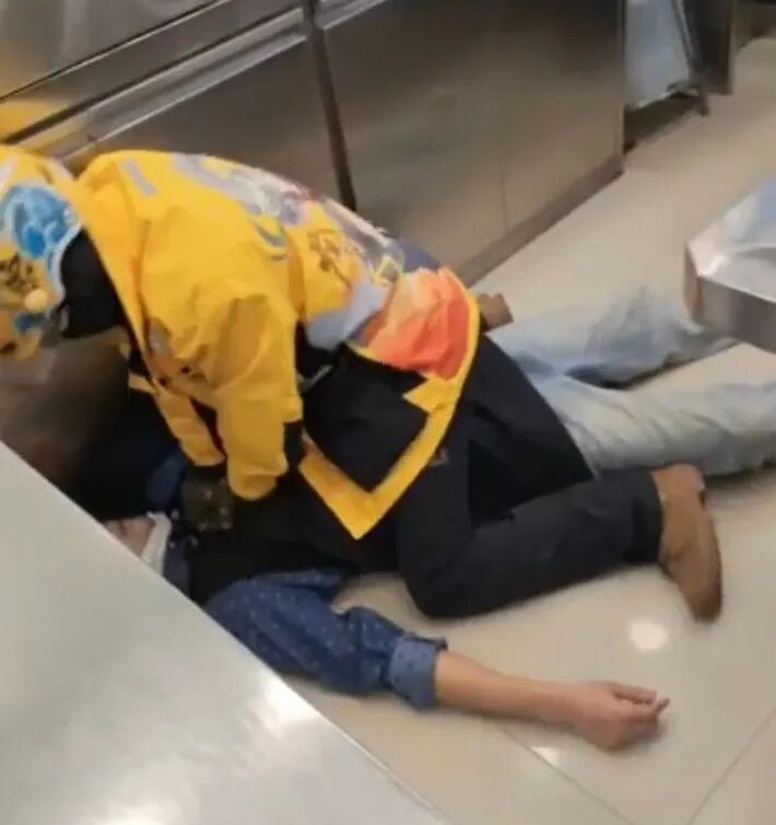 现场,店内一名20岁店员小伙斜倒在柜台内侧地面上,意识全无。一名女店员跪地持续按压着胸腔,脸上写满焦急无助,眼看着体力不支,手劲也越来越小。
