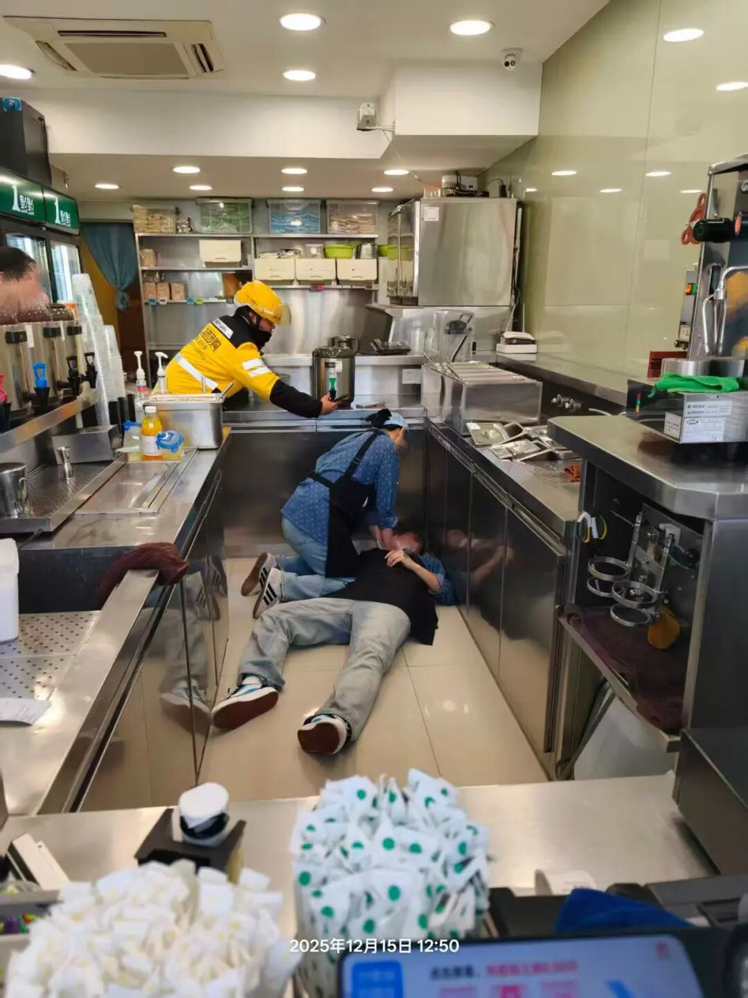 事情发生在12月15日中午,杭州滨江一家临街奶茶店内。出手施救的外卖小哥叫李洪双,当时前来店里取餐的他,恰巧碰上了这么个突发情况。