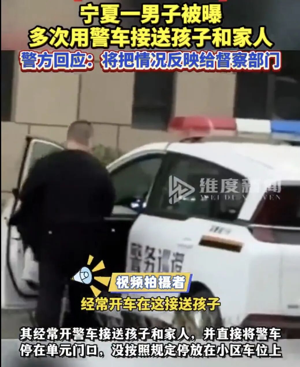 近日,有网友发布视频称,宁夏回族自治区吴忠市一男子穿便服用警车接送孩子。拍摄者称“该男子为当地一派出所民警,经常看到对方用警车接送孩子和家人,没停在车位上、直接停在单元门口了”。