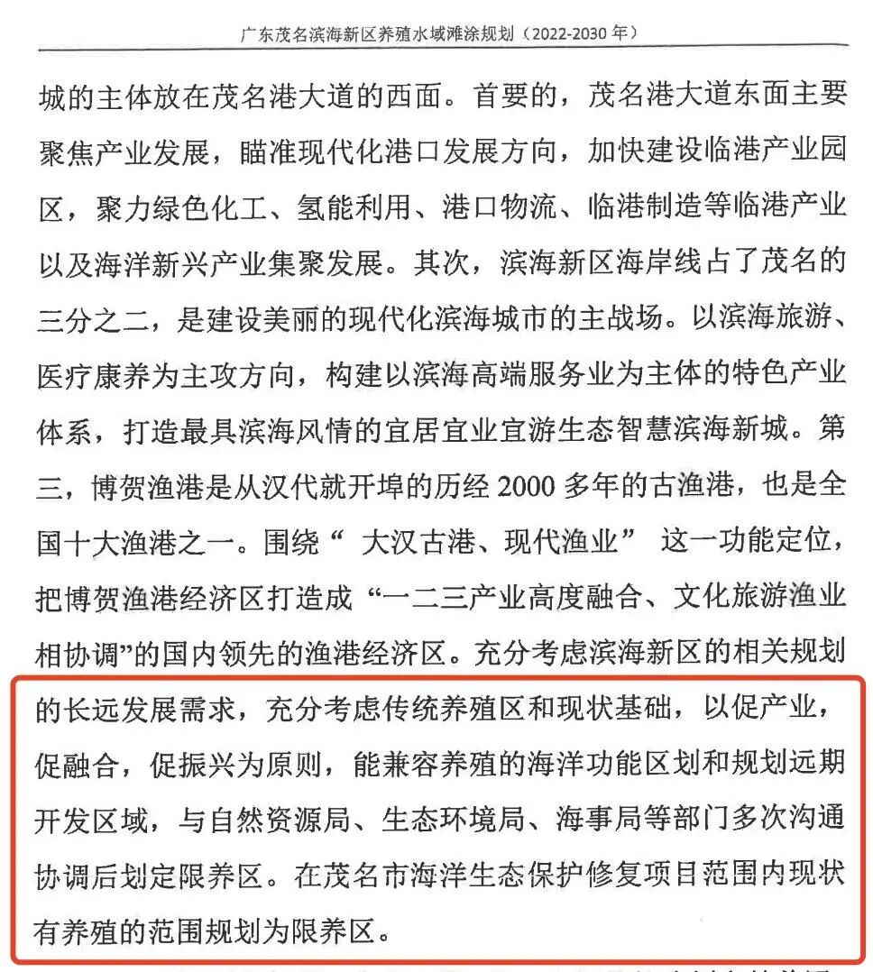 林华杰告诉红星新闻,按照《规划》,他认为自家农场不属于“禁养区”,而是“限养区”。记者看到,上述《规划》称,养殖水域滩涂分为禁止养殖区、限制养殖区、养殖区三类。《规划》还规定,充分考虑传统养殖区和现状基础,以促产业、促融合、促振兴为原则,能兼容养殖的海洋功能区划和规划远期开发区域,与自然资源局、生态环境局、海事局等部门多次沟通协调后划定限养区。在茂名市海洋生态保护修复项目范围内现状有养殖的范围规划为限养区。