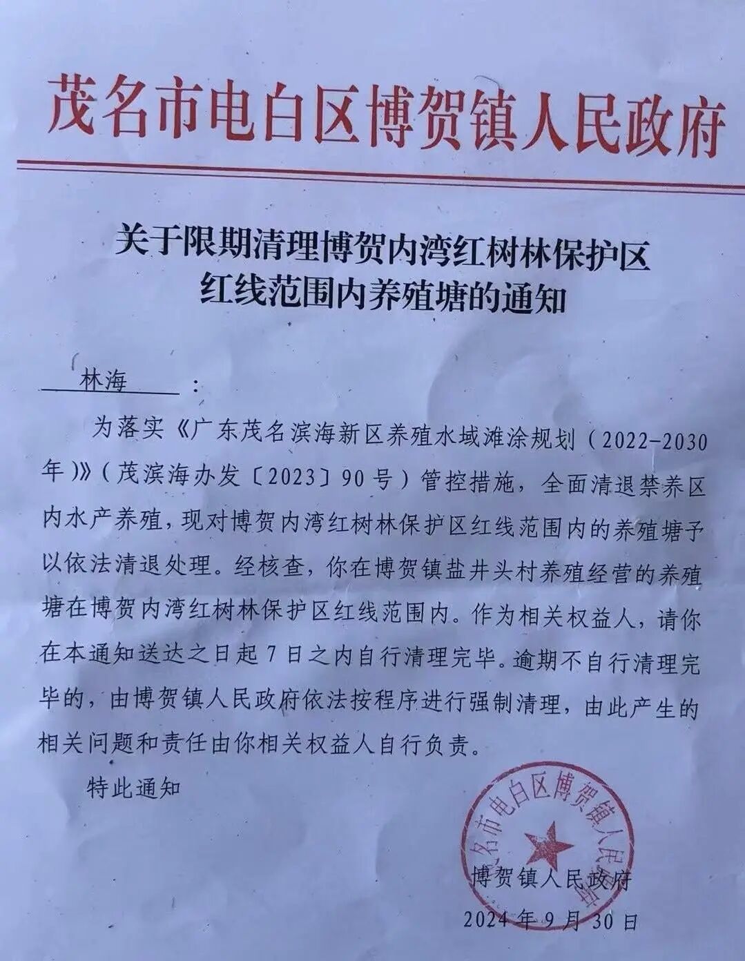 正当林华杰干劲十足时,2024年9月30日,博贺镇政府向林海下发《关于限期清理博贺内湾红树林保护区红线范围内养殖塘的通知》,称为落实《广东茂名滨海新区养殖水域滩涂规划(2022-2030年)》(以下简称《规划》),全面清退禁养区内水产养殖,对博贺内湾红树林保护区红线范围内的养殖塘予以依法清退处理,要求“蓝海湾家庭农场”7日内自行清退,否则将强制清理。