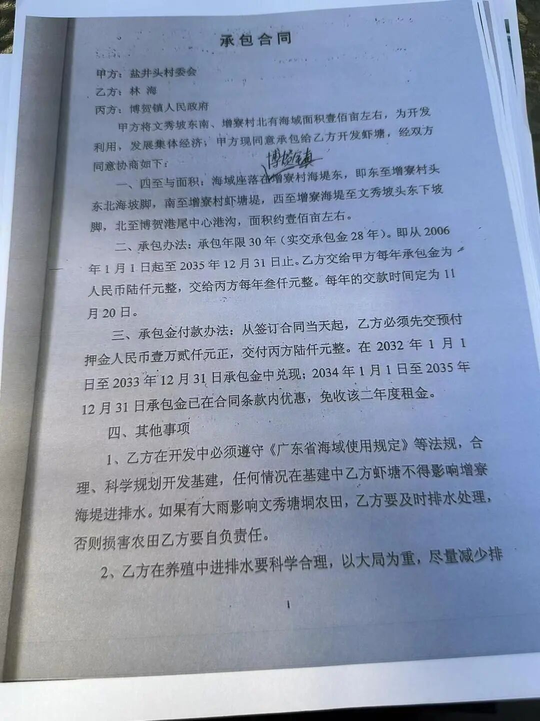 林海、林华杰父子是茂名市电白区当地人。2005年,父亲林海与博贺镇政府、盐井头村委会签订合同,承包电白区博贺镇增寮村海堤东的100亩海域滩涂,开发虾塘。承包期限30年,实交承包金28年,2035年年底到期。