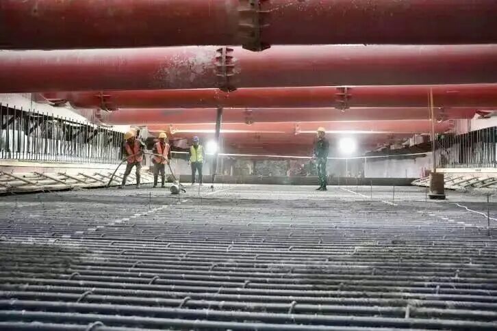 本次浇筑的首块底板位于项目盾构隧道明挖暗埋区域,长18米、宽14.1米、厚1.3米,累计浇筑混凝土348.62立方米。作为隧道主体结构的核心基础,底板施工质量直接关系到后续工程安全与整体稳定性。