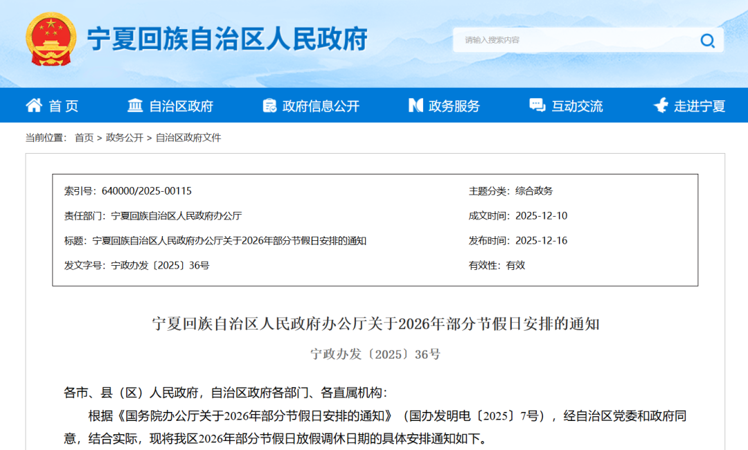 根据《国务院办公厅关于2026年部分节假日安排的通知》(国办发明电〔2025〕7号),经自治区党委和政府同意,结合实际,现将我区2026年部分节假日放假调休日期的具体安排通知如下。