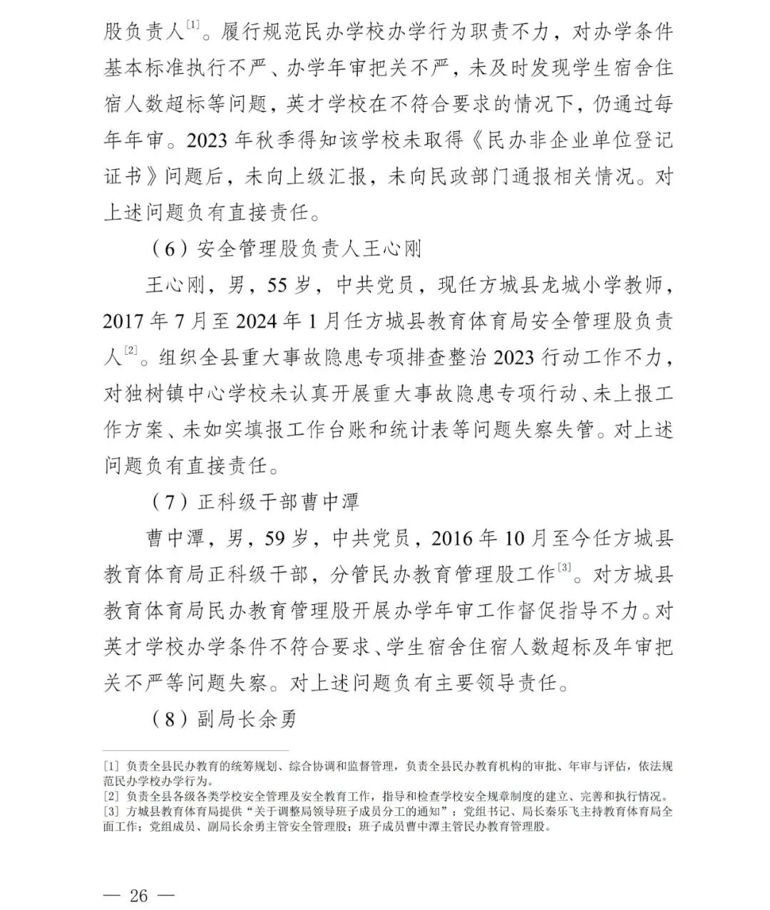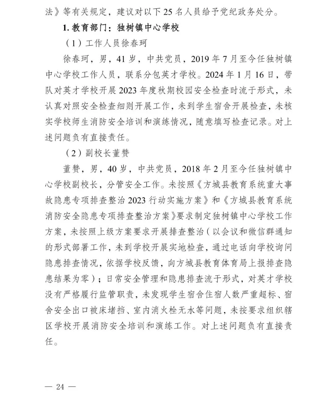 12月17日,河南省消防救援总队网站发布《河南方城县独树镇砚山铺村英才学校“1·19”重大火灾事故调查报告》。其中披露相关问责情况: