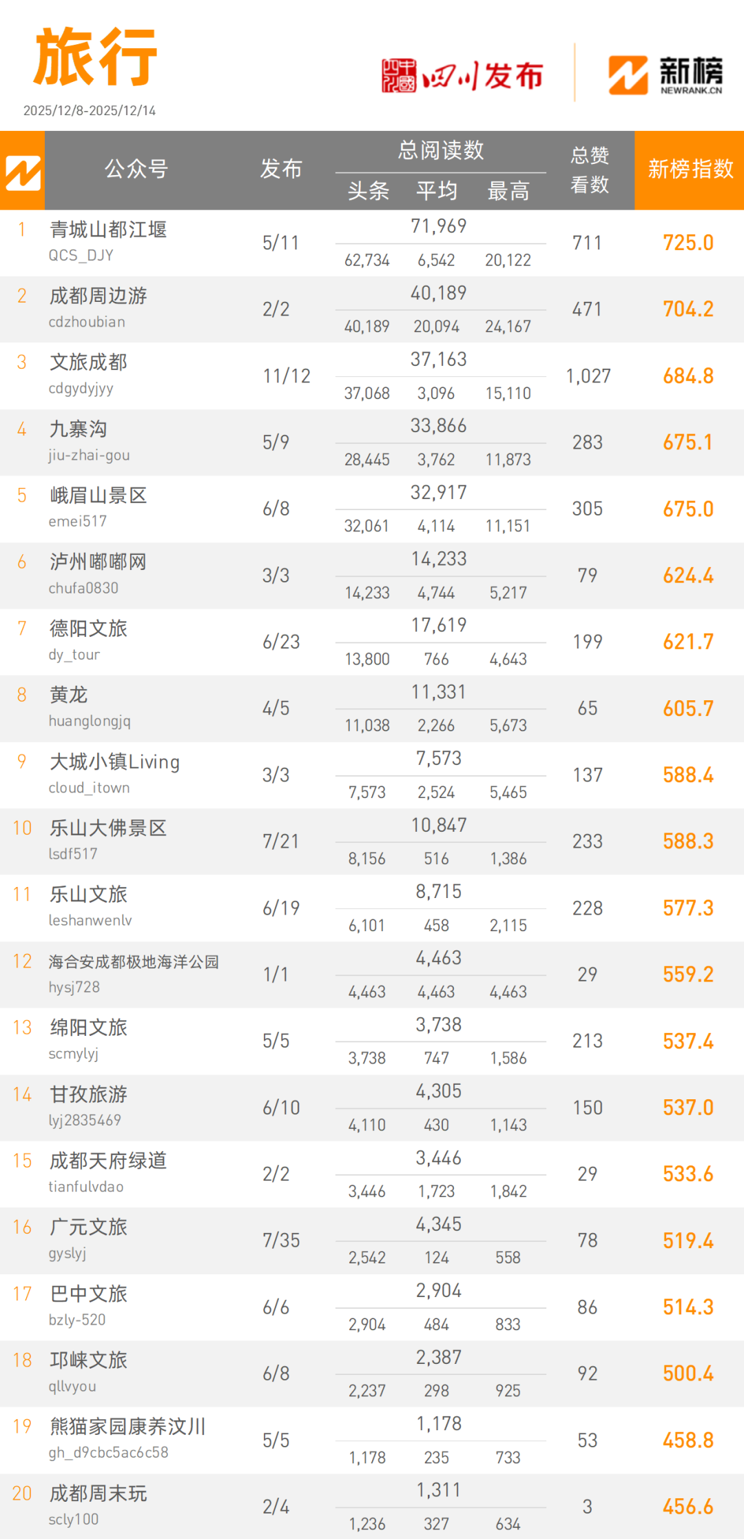 “青城山都江堰”本周以71969阅读量总数,725.0的新榜指数摘得旅行类榜单桂冠,“成都周边游”本周以40189阅读量总数,704.2的新榜指数将旅行类榜单榜眼收入囊中。