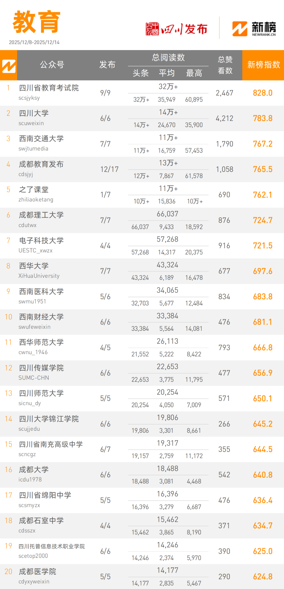 “四川教育考试院”本周以320000+次阅读量总数,828.0新榜指数领跑教育类榜单,“四川大学”本周以140000+次阅读量总数,783.8新榜指数获得教育类榜单第二名。